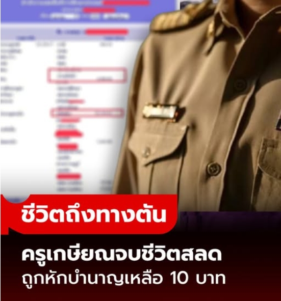 เกิดเหตุสะเทือนใจในสังคม เมื่อครูวัยเกษียณรายหนึ่งในภาคอีสาน ตัดสินใจจบชีวิตตนเอง หลังเผชิญปัญหาการเงินอย่างหนัก จากการถูกหักเงินบำนาญชำระหนี้จนเหลือเงินใช้เพียงเดือนละ 10 บาท ทั้งที่ก่อนหน้านี้พยายามขอความอนุเคราะห์จากหน่วยงานที่เกี่ยวข้องแล้ว แต่ไม่เป็นผล