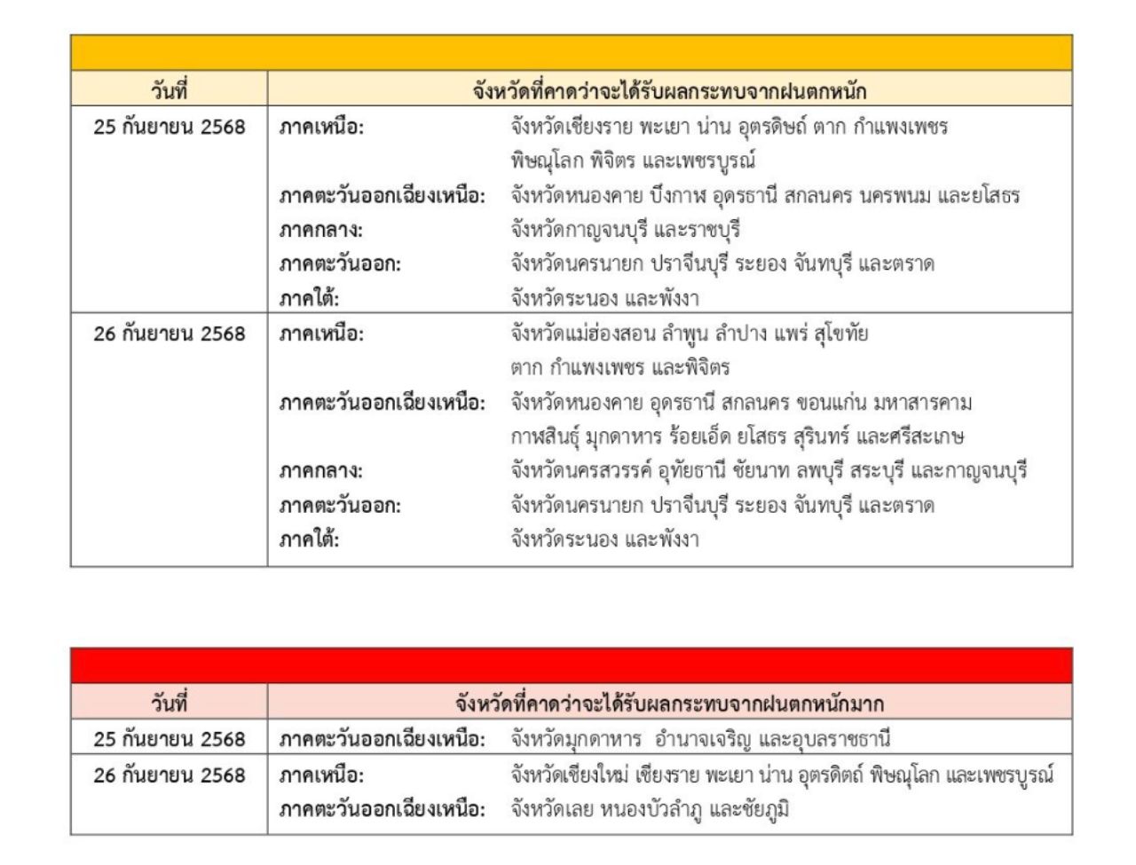 ทั้งนี้ ขอให้ประชาชนในบริเวณดังกล่าวระวังอันตรายจากฝนตกหนักถึงหนักมากและฝนที่ตกสะสม ซึ่งอาจทำให้เกิดน้ำท่วมฉับพลัน น้ำป่าไหลหลาก และน้ำล้นตลิ่ง โดยเฉพาะพื้นที่ลาดเชิงเขาใกล้ทางน้ำไหลผ่าน พื้นที่ลุ่ม และพื้นที่น้ำท่วมขัง สำหรับคลื่นลมบริเวณทะเลอันดามัน และอ่าวไทยตอนบนมีกำลังแรงขึ้น โดยทะเลอันดามันตอนบนมีคลื่นสูง 2-3 เมตร บริเวณที่มีฝนฟ้าคะนองคลื่นสูงมากกว่า 3 เมตร ขอให้ชาวเรือเดินเรือด้วยความระมัดระวัง และเรือเล็กบริเวณทะเลอันดามันตอนบนควรงดออกจากฝั่งในช่วงวันที่ 25-26 ก.ย. 68