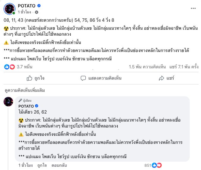 ล่าสุดเพจ POTATO โพสต์ให้เลขเด็ดก่อนถึงการประกาศรางวัลสลากกินแบ่งรัฐบาล งวดประจำวันที่ 16 ต.ค. 2568 โดยบอกว่า “08, 11, 43 (กดแชร์สะดวกกว่านะครับ) 54, 75, 86 วิ่ง 4 วิ่ง 8” และคอมเมนต์เพิ่มเติมว่า “ไม้เดียว 26, 62”